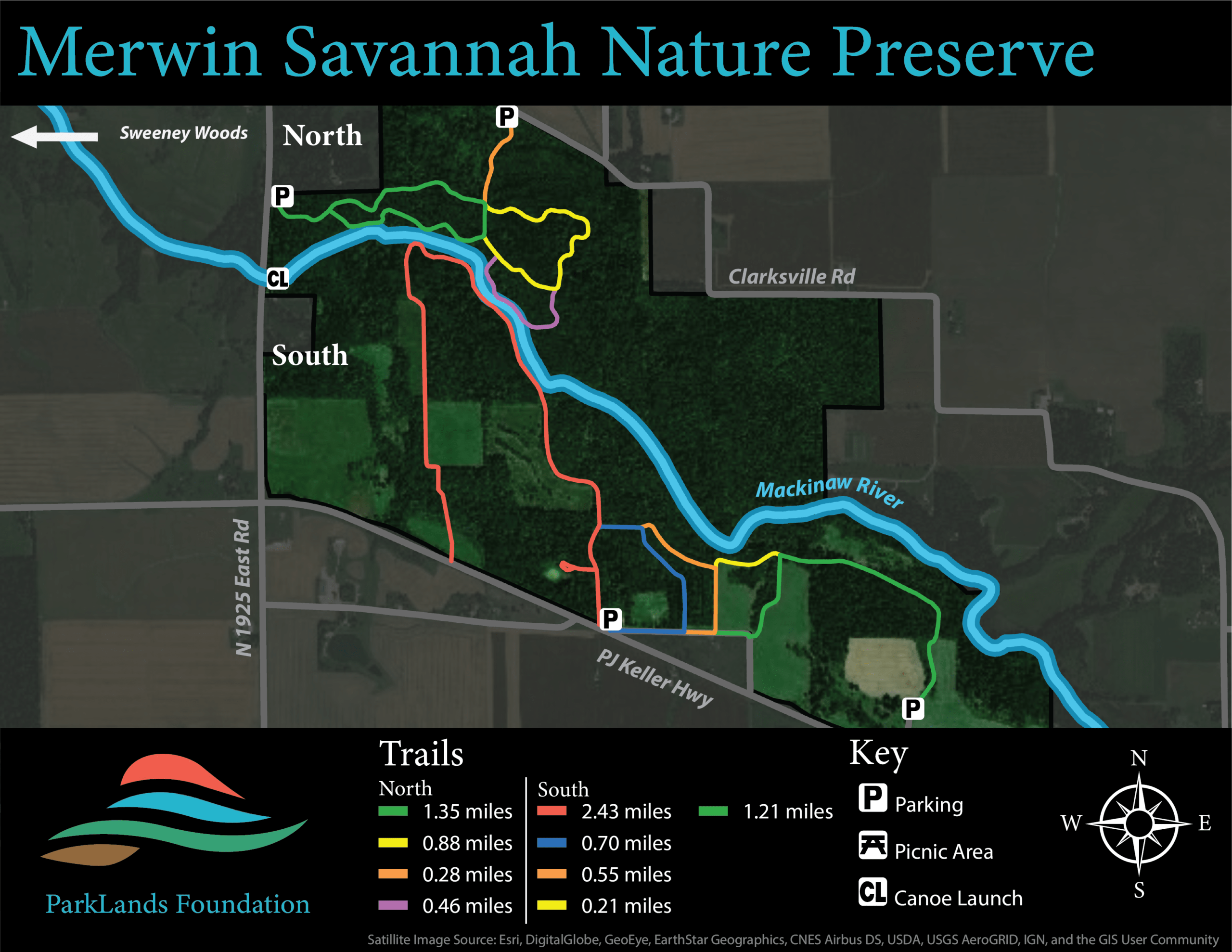 Multiple Access & Parking Areas: North Access/Parking: 40.6690925, -88.8887067 West Access/Parking: 40.6661607, -88.8990820 Canoe Launch: 40.6631881, -88.8993151 South Access/Parking: 40.6523419, -88.8845666 |